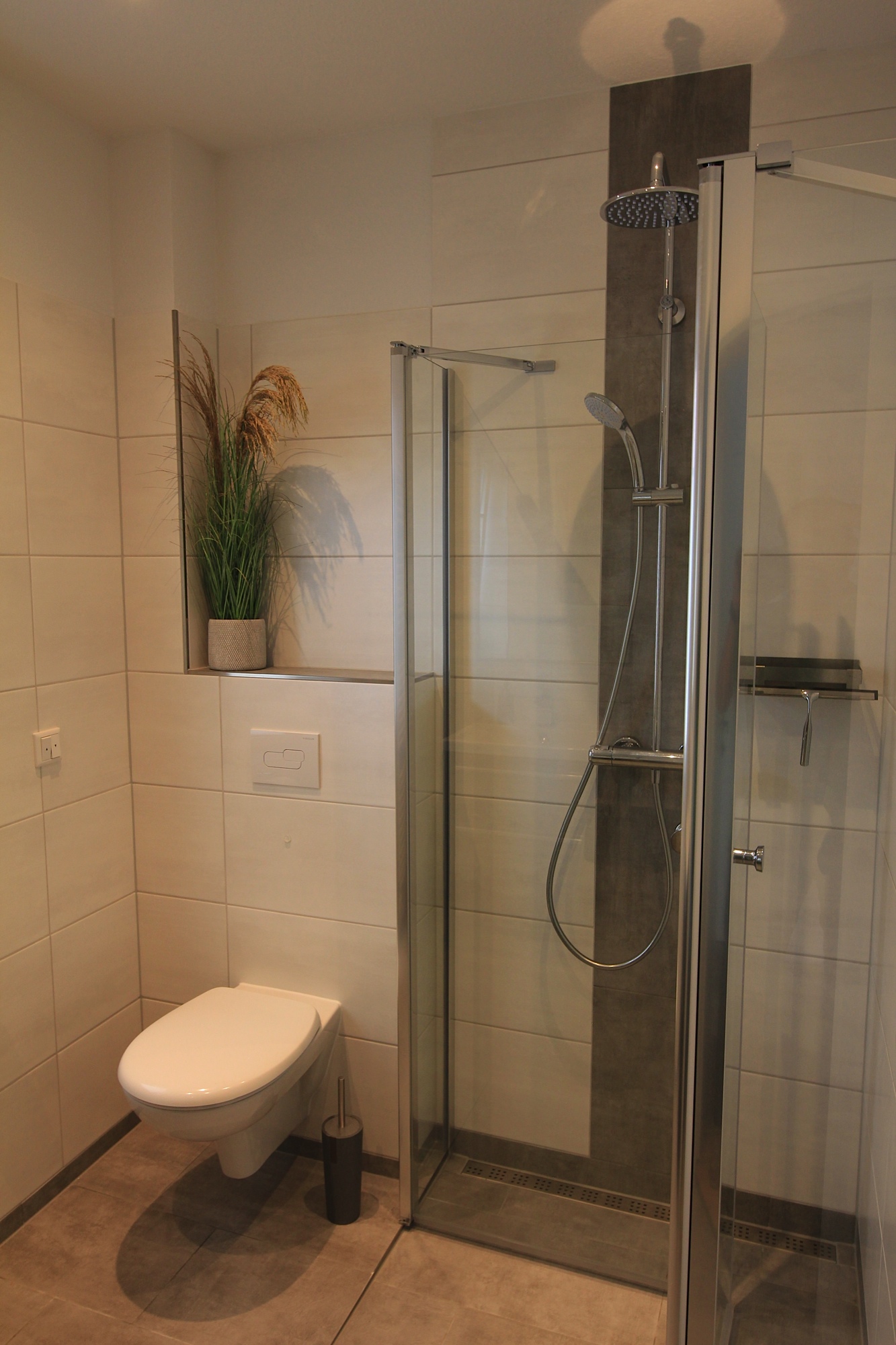 Badezimmer: WC, Waschbecken mit Unterschrank, Rainshower-Dusche (ebenerdig 1,00 x 1,00 m), Handtuchwärmer, Fußbodenheizung