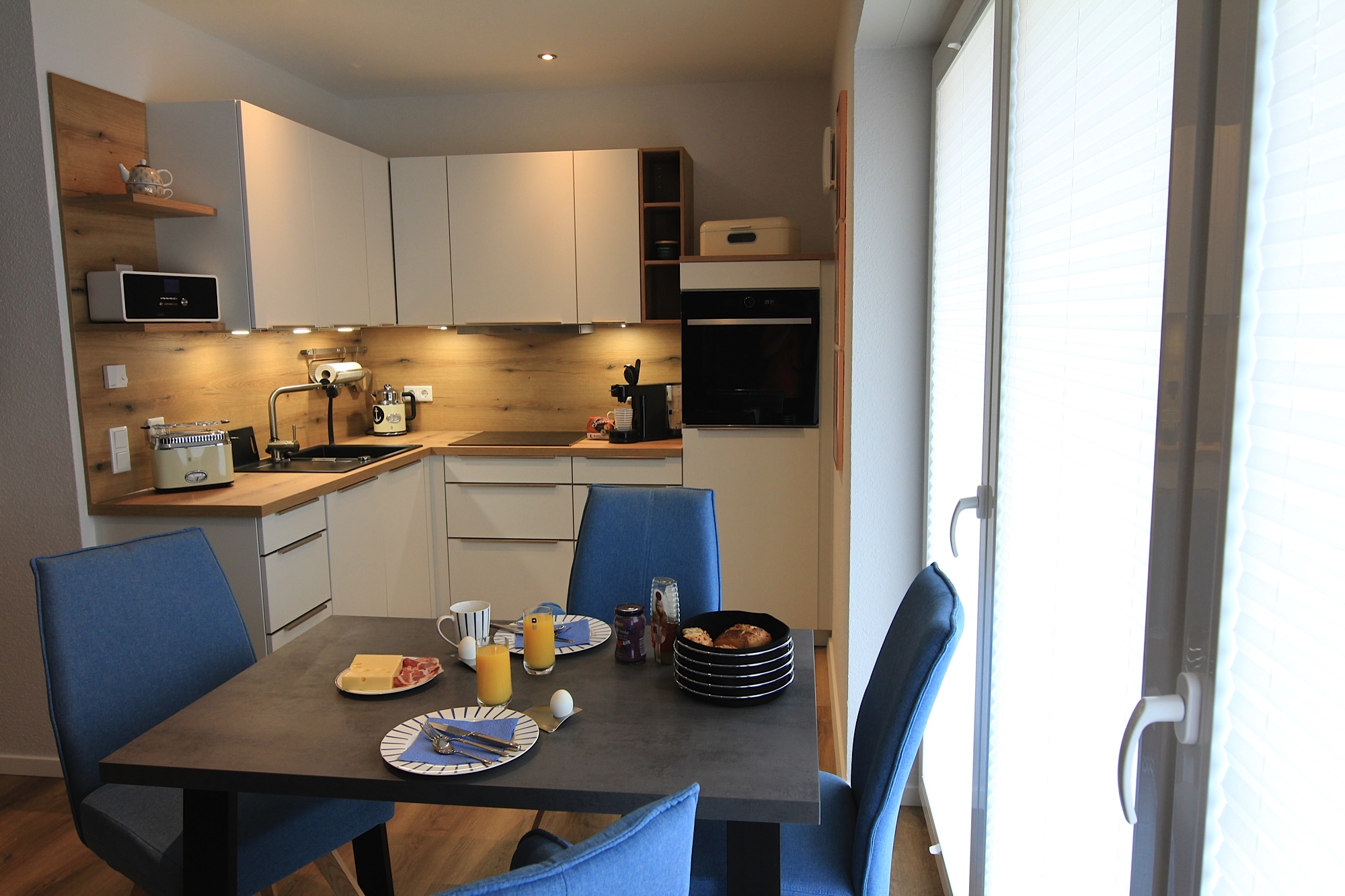 Küche: hochwertige Einbaugeräte, Ceran-Kochfeld & Backofen, Microwelle, Geschirrspülmaschine, Kühl-Gefrier-Kombination, Wasserkocher, Toaster, Eierkocher, Handmixer, Senseo-Switch (Kaffepad und Filtermaschine), Essbereich