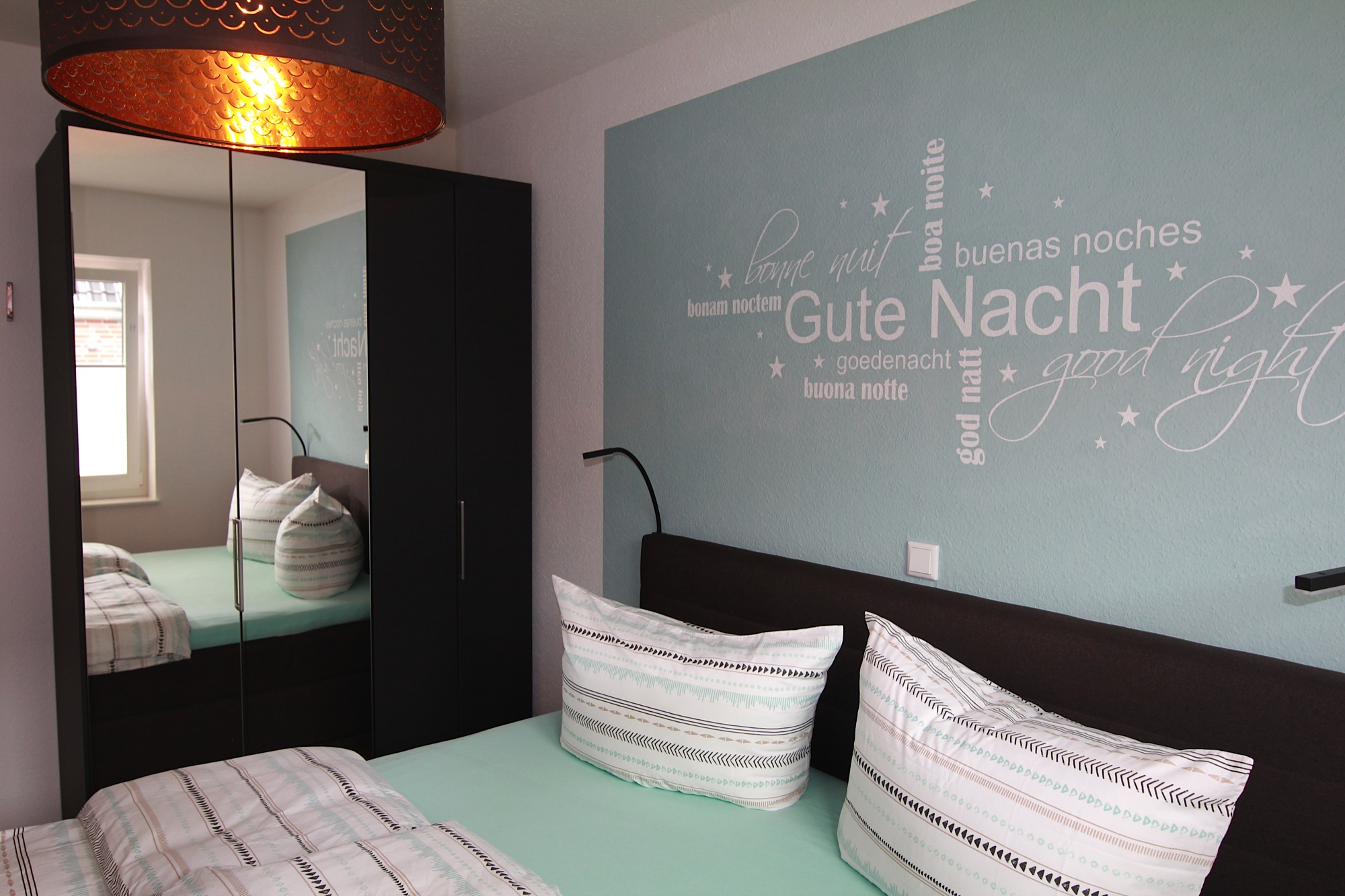 Schlafzimmer: Boxspringbett (180×200, durchgehende Matratze), Smart-Flat-TV (50 Zoll, WLAN, Bluetooth), Kleiderschrank mit Ganzkörperspiegel