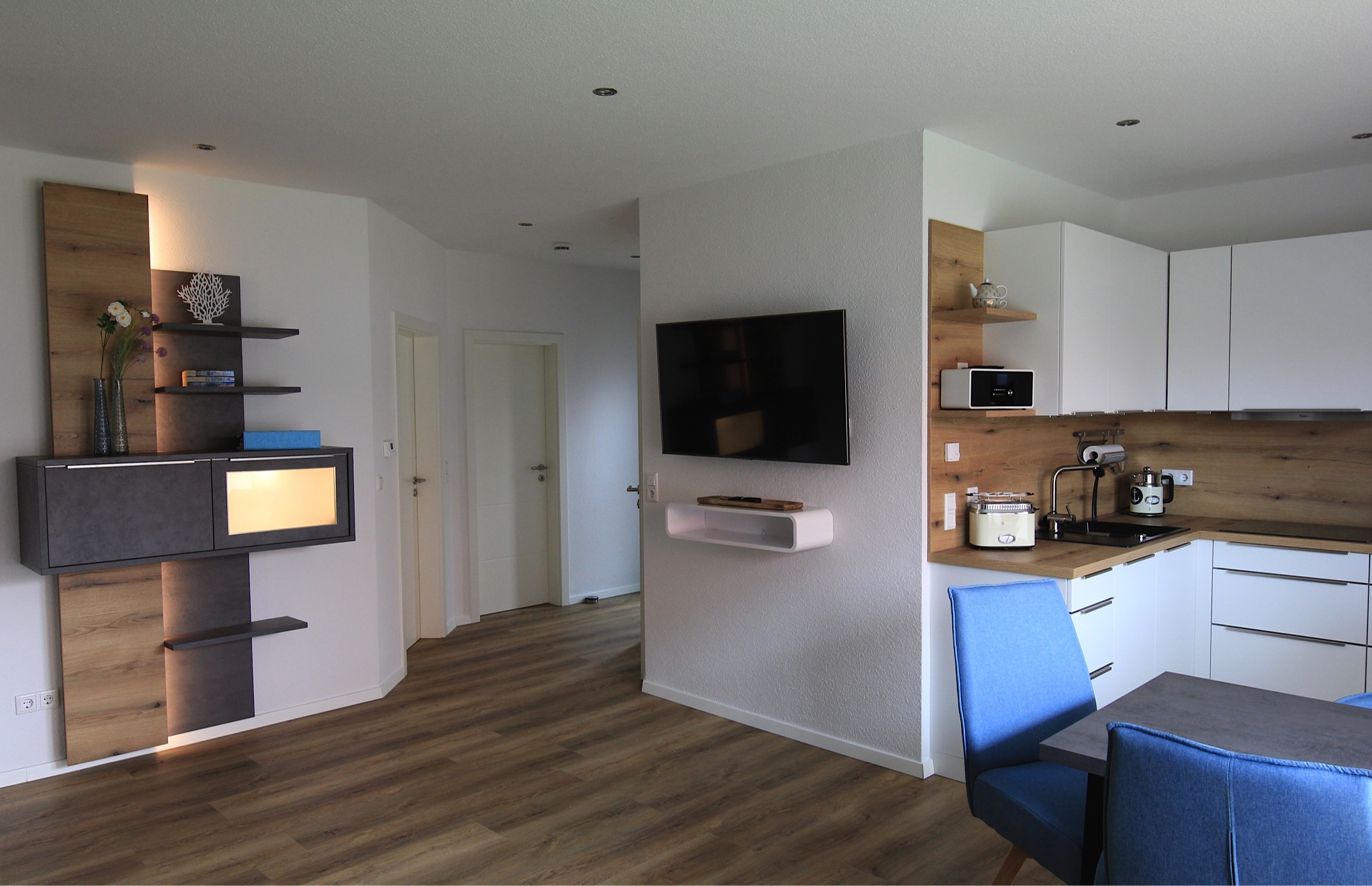Die gemütliche und moderne Erdgeschoßwohnung mit Terrasse und kleinem Gartenanteil ist für 2-Personen geeignet. Die Wohnung hat einen offenen Wohn-/Essbereich mit voll ausgestatteter Küche und einem gemütlichen Wohnzimmerbereich mit Smart-Flachbild-TV und WLAN. Von hier kommen Sie auf die Terrasse, die sich für entspannte Grillabende eignet. Das Schlafzimmer ist mit einem Boxspringbett (180×200) und einem Smart-Flachbild-TV ausgestattet und lädt genauso zur Erholung ein, wie das angrenzende Wellnesszimmer mit Infrarotkabine. Das Bad überzeugt durch eine bodentiefe Rainshower-Dusche. Direkt am Haus können Sie Ihr Auto parken und im Aussenabstellraum finden neben der Waschmaschine auch Ihre E-Bikes Platz.